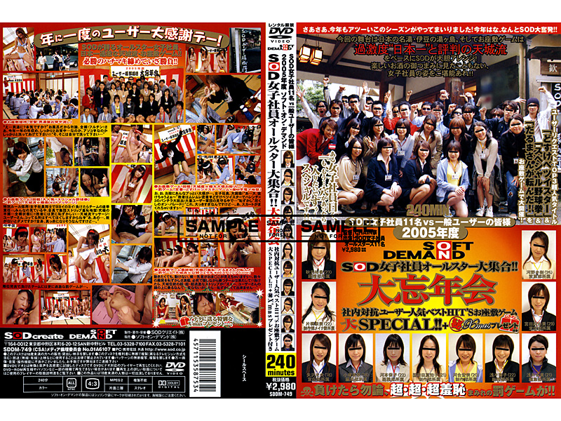SOD各部署から厳選された美人女子社員が、1年の感謝を込めてユーザーを忘年会で接待します!大好評お座敷ゲームには、新・羞恥ゲームをたっぷりプラス!さらに温泉を舞台に趣向を凝らしたSPイベントで大乱交!!